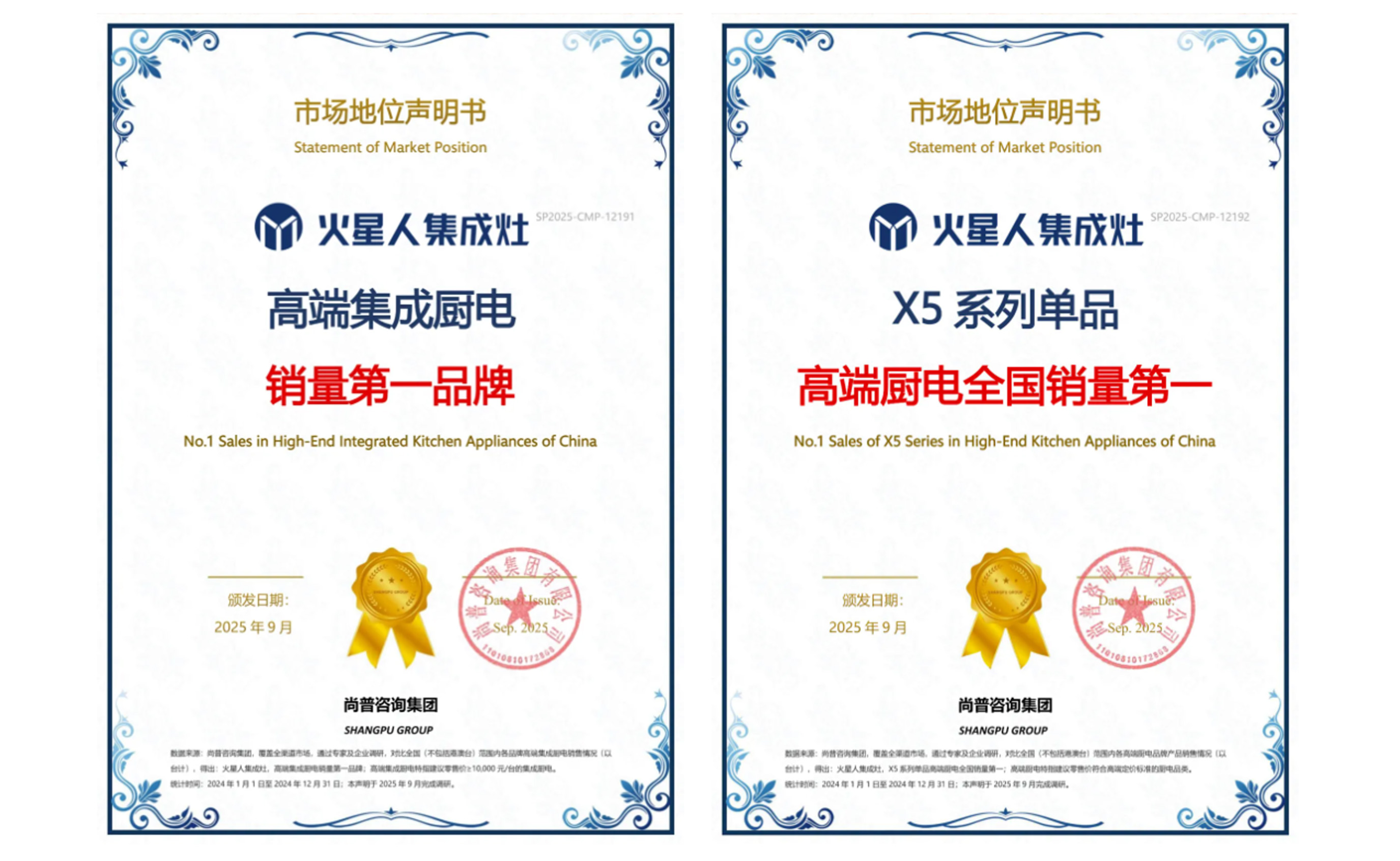 双冠为证!火星人集成灶X5单品全国称冠,品牌稳居高端集成厨电第一