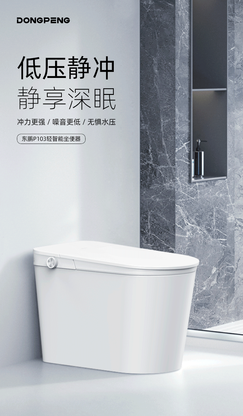 P103轻智能马桶是集零压静音冲、脚感免触、银离子抗菌等多项科技于一体的智能卫浴产品,以低压静冲技术突破水压限制,用人性化设计重构洁净体验,用节能标准践行绿色理念,用专业实力赢得权威认可,是东鹏卫浴以科技赋能品质生活的匠心之作,实至名归!