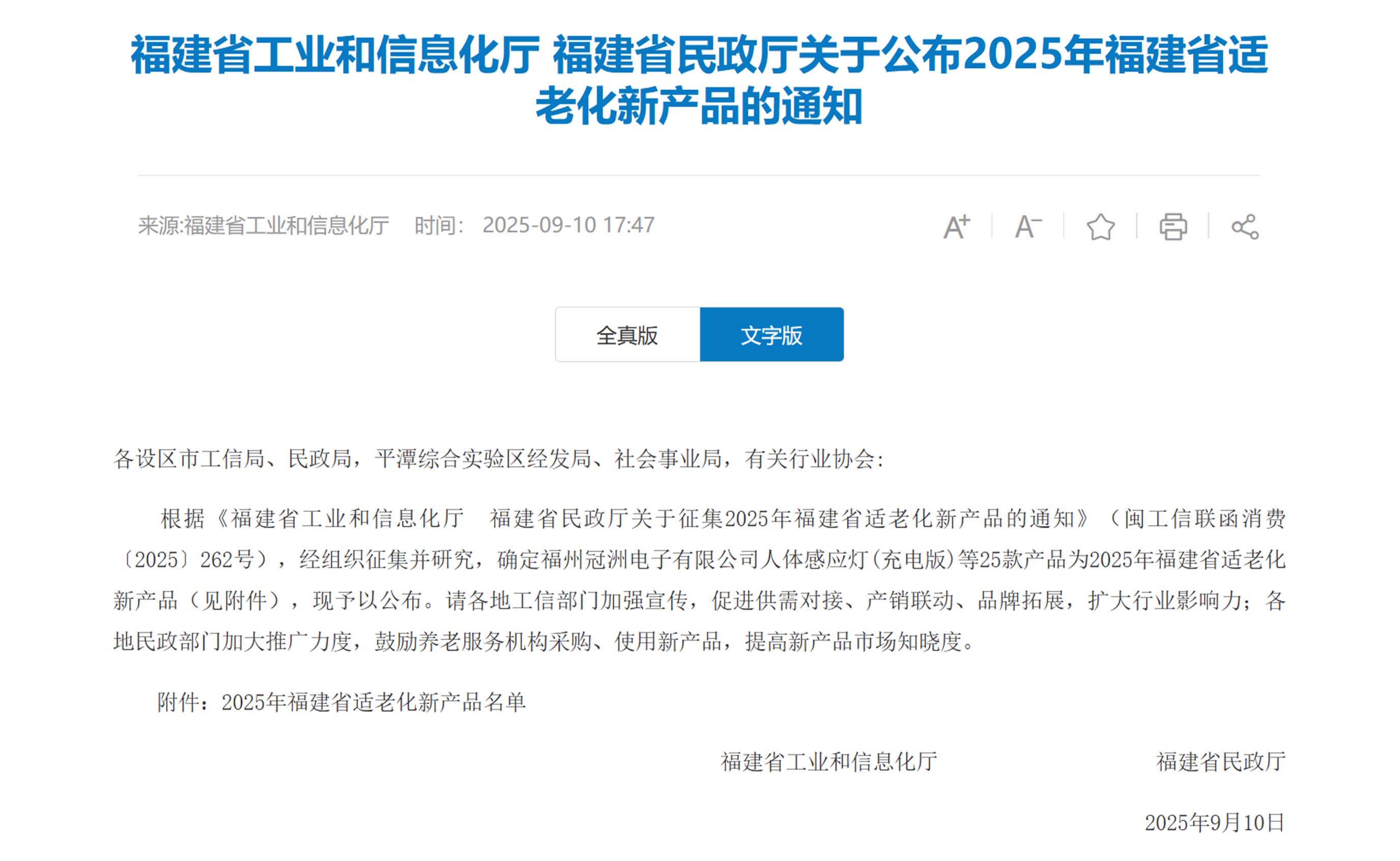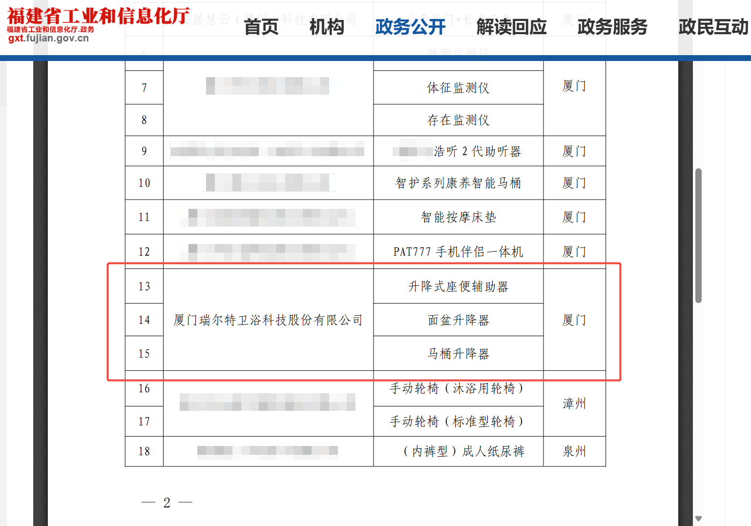 近日,福建省工信局、民政局联合发布《2025年福建省适老化新产品名单》。全省仅25款产品成功入选,R&T瑞尔特凭借卓越的创新能力和深厚的技术积累,升降式座便辅助器、面盆升降器、马桶升降器三款产品悉数上榜,彰显了R&T瑞尔特在智慧康养领域的领先地位与品牌影响力。