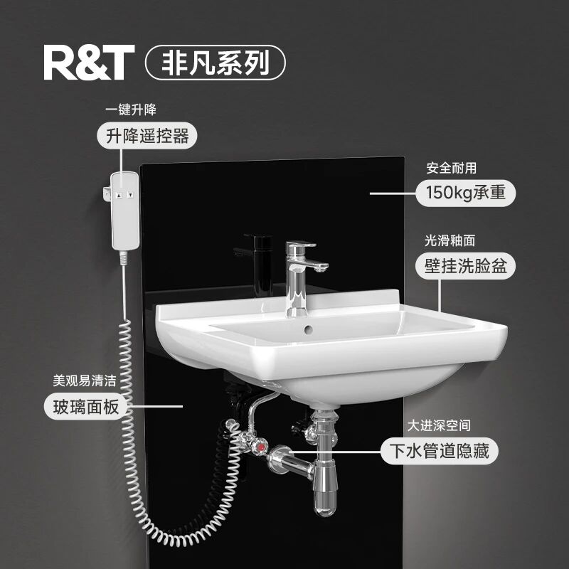 高度可调节的升降洗面器,使用户能够根据个人的使用要求进行自由调节,能够同时满足成年人、小孩以及轮椅使用者的使用