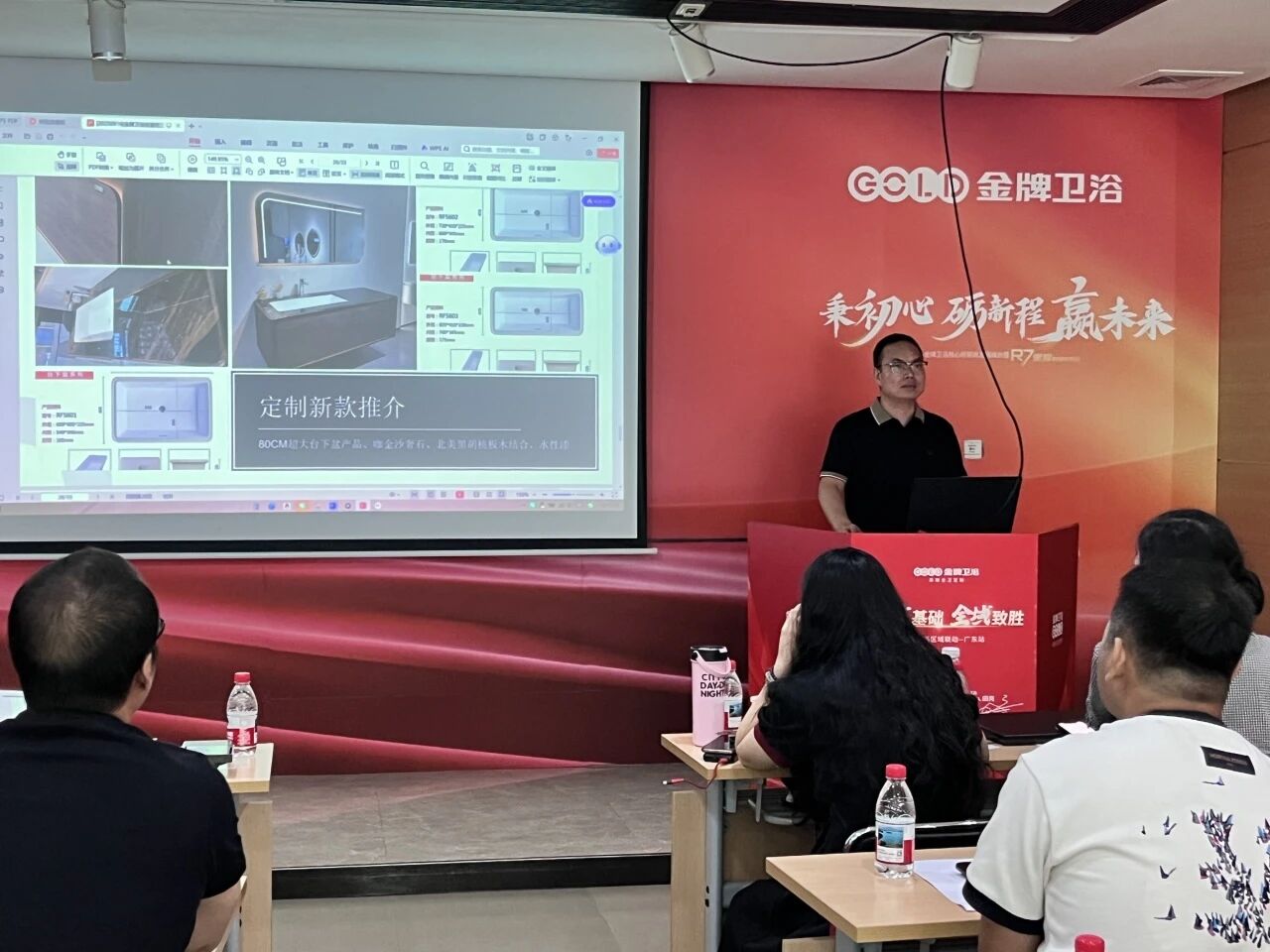 在非标定制专题环节,金牌卫浴非标定制项目负责人谢建政通过实战模拟,系统培训了小程序报价系统的操作流程,显著提升了经销商在定制业务中的响应速度与成本控制能力。同时,重磅发布了浴室柜系列新品,从设计理念、材质工艺到场景适配优势进行了全方位剖析,为终端输出一套完整、高效的定制产品解决方案。