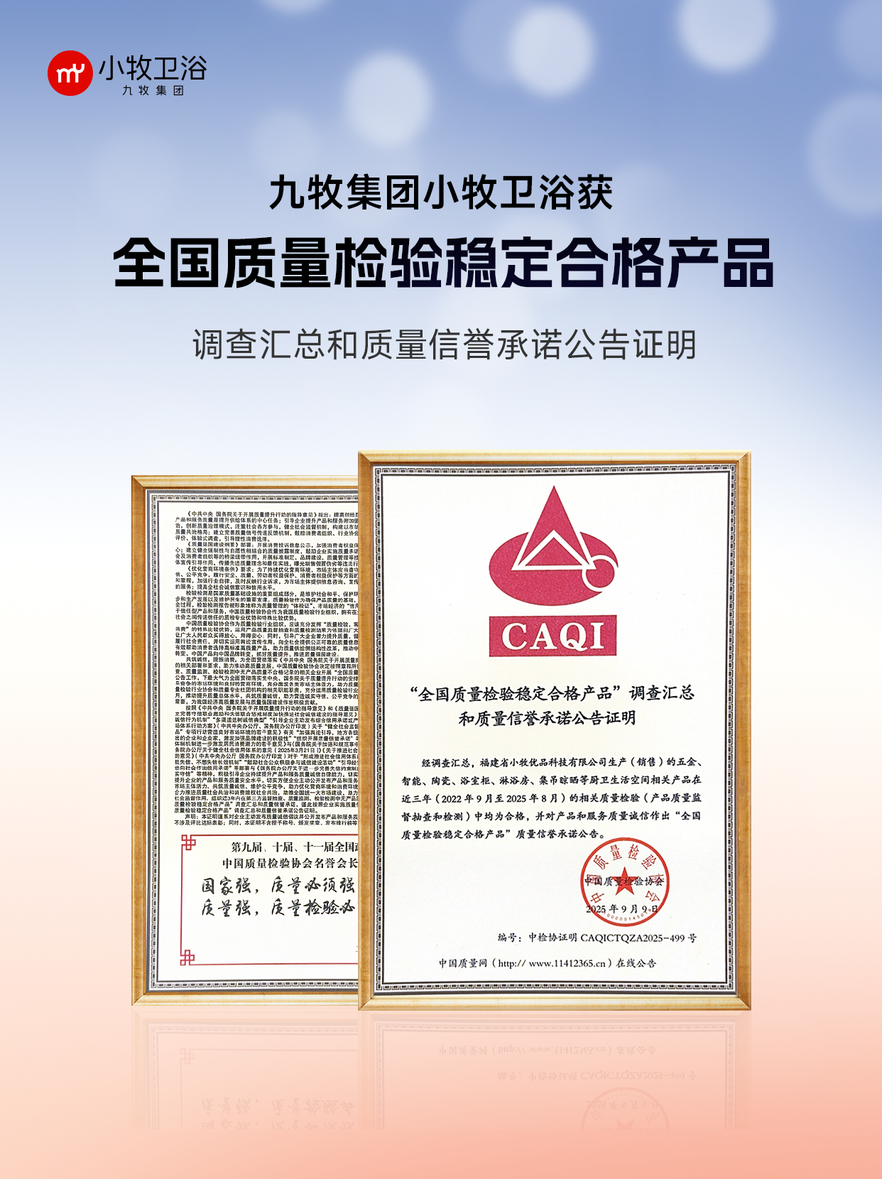 据中国质量检验协会调查汇总,九牧集团小牧卫浴生产(销售)的厨卫全品类产品,包括五金、智能、陶瓷、浴室柜、淋浴房等,在近三年(2022年9月至2025年8月)的各项质量检验中均合格,获得“全国质量检验稳定合格产品”认证!