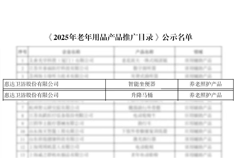 近日,国家工业和信息化部正式发布《2025年老年用品产品推广目录》,惠达卫浴凭借智能坐便器和升降马桶成功入选。这是继荣膺“亚洲品牌500强”这一重要行业奖项后,惠达再次获得的重要国家级认可,充分体现了其在产品研发、技术创新与人文关怀方面的综合实力。