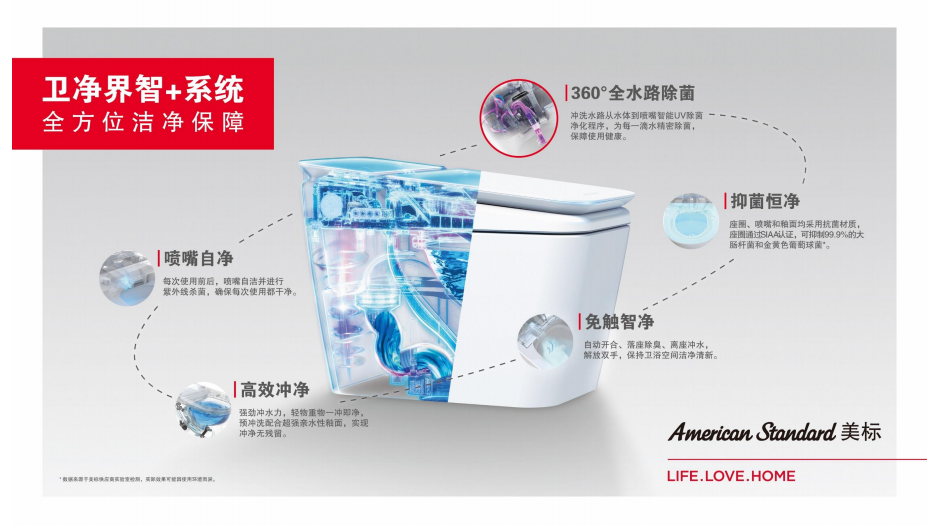 后疫情时代,美标智能马桶系列的“卫净界”技术升级为“卫净界智+”技术,新增UV光净技术,实现360°全水路除菌;使用前后喷嘴自动紫外线杀菌,搭配 SIAA 抗菌座圈(抗菌率超99%),为用户构建全方位健康如厕环境。