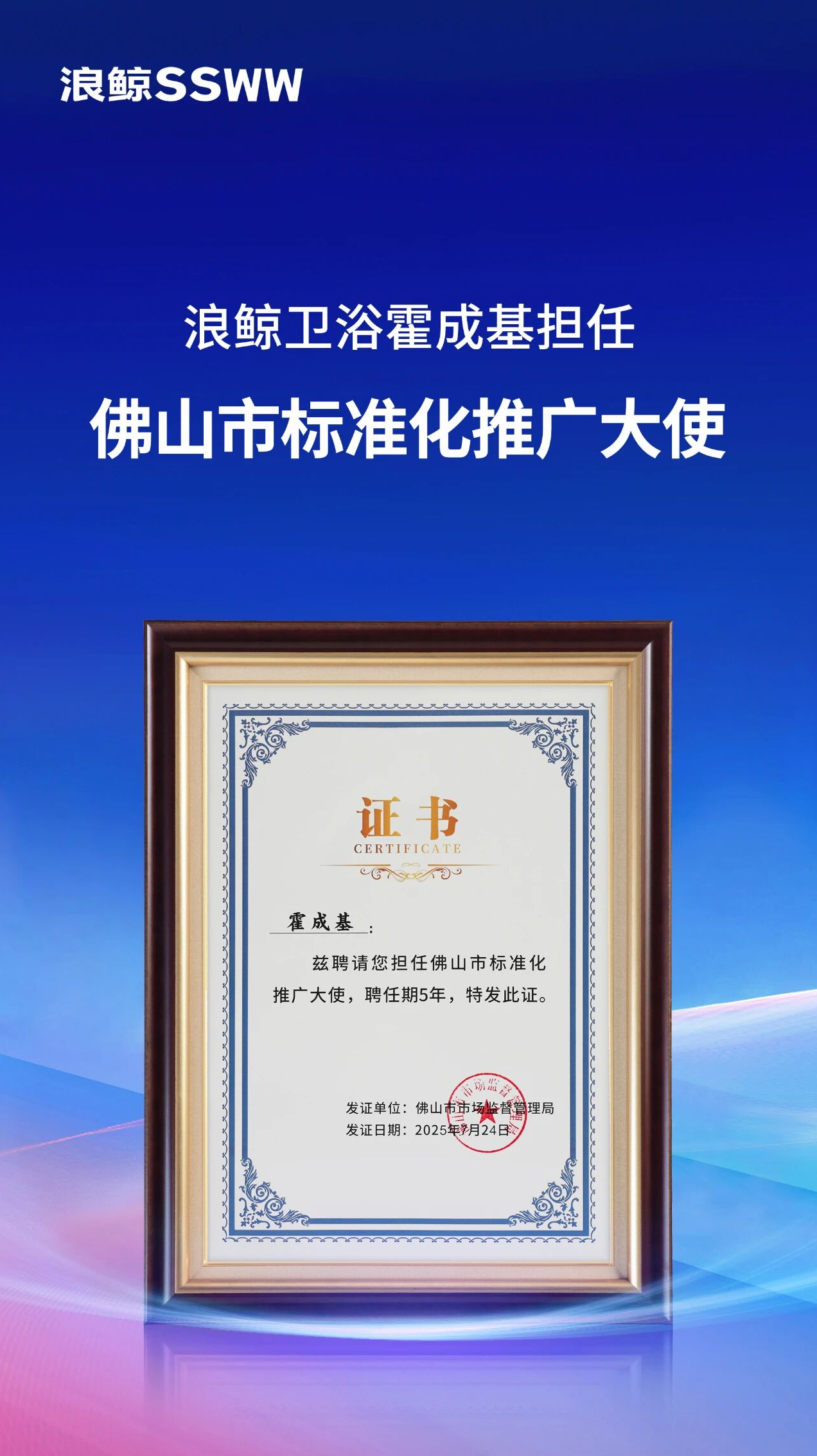 近日,佛山市市场监督管理局公布佛山市标准化推广大使名单,浪鲸卫浴董事长霍成基荣耀入选,聘期5年。这一荣誉,是对霍成基董事长及浪鲸卫浴在推动行业标准化建设、智能化升级方面卓越贡献的高度认可。