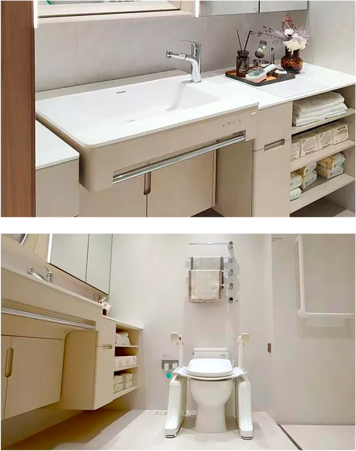 卫生间作为居住痛点的高发区,尤其对于长者而言,潜藏着诸多安全隐患。面对日益凸显的社会老龄化挑战,恩仕与中海共同探索适老宜居新方案,打造更便捷、更安全的卫生间环境。智能升降康养浴室柜,台面高度自由调节,坐轮椅也可舒适使用;智能升降坐便椅在老人起坐之间提供平稳支撑,成为“健康人居系统”中不可或缺的一环。