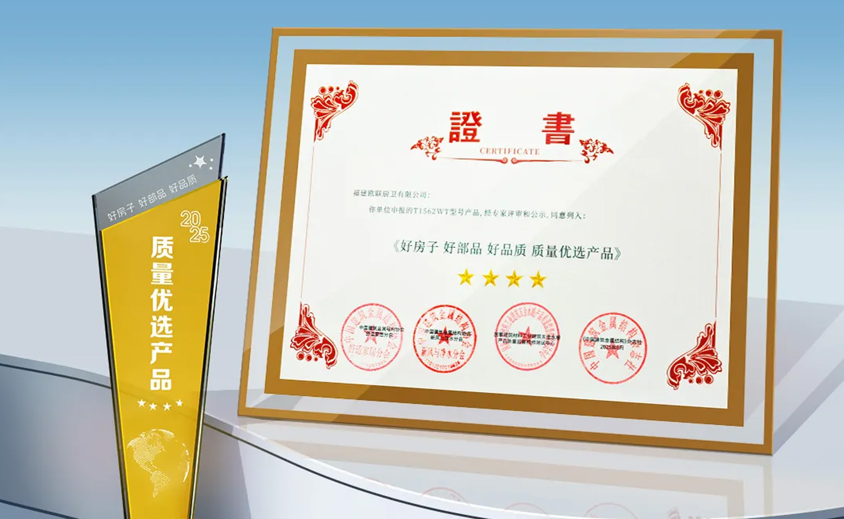 2025年6月4日,在上海会展中心举办的第四届“好房子·好部品·好厨卫”建筑人居环境交流会上,凭借精心打造的T1562WT智能马桶,在众多优质产品中崭露头角脱颖而出,荣获国家级“质量优选产品”认证。
