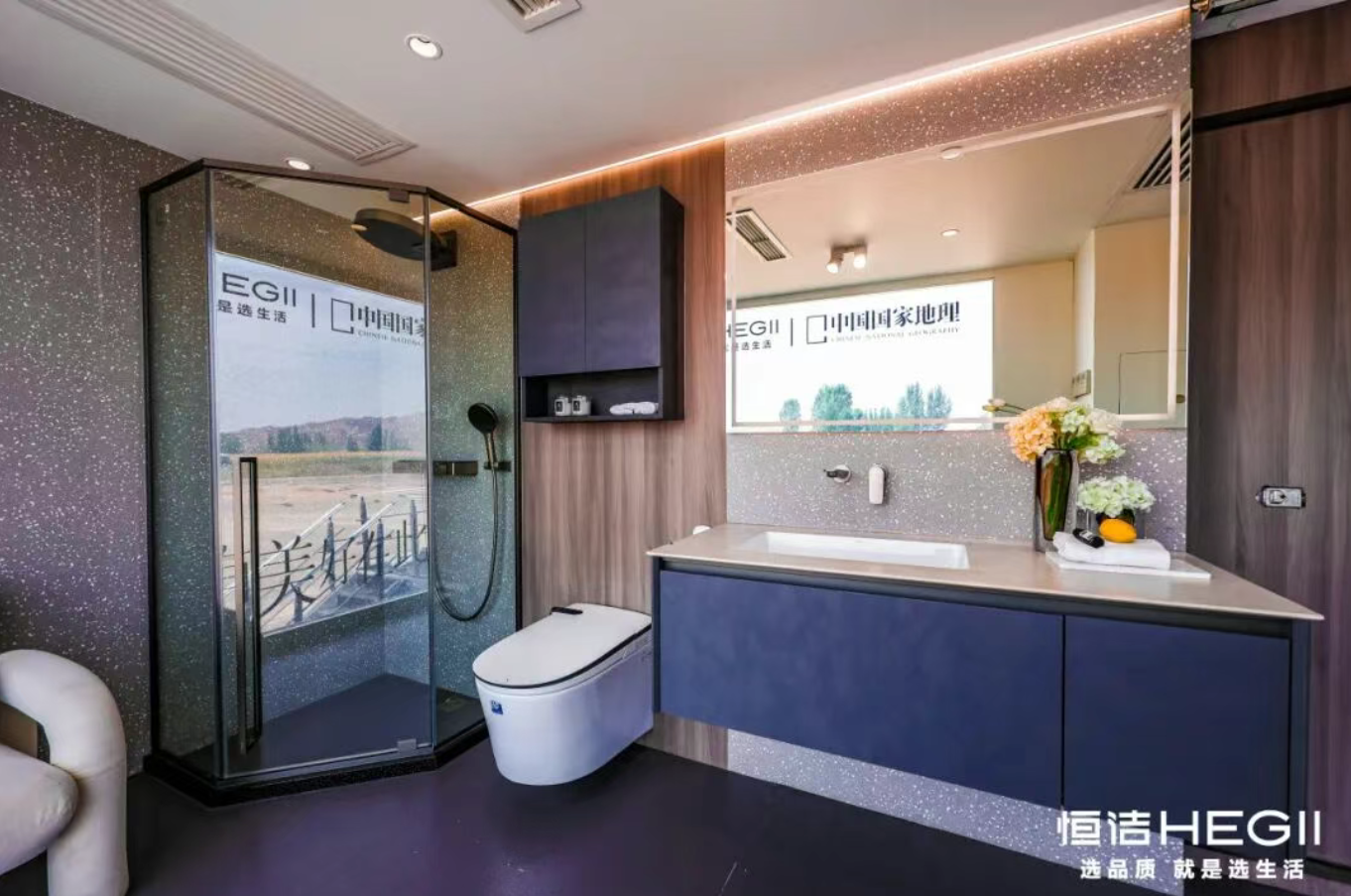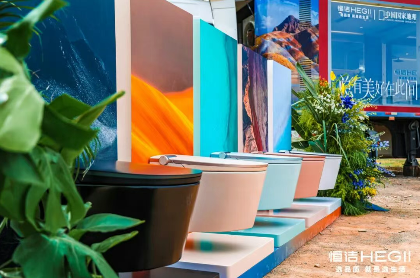 车下是恒洁与中国国家地理跨界合作的大美中国五色定制产品核心展区。展区以华夏大地壮丽山河为灵感,凝练出五种独具东方美学的色彩,将自然的壮丽与人文的深邃融入卫浴美学。其中重点展示的恒洁N8S智能一体机,融合“大美五色”设计哲学成现场关注亮点。它搭载了行业首创的无水箱超薄挂架和墙排虹吸0压静冲技术,打破空间限制,智享优雅舒适。